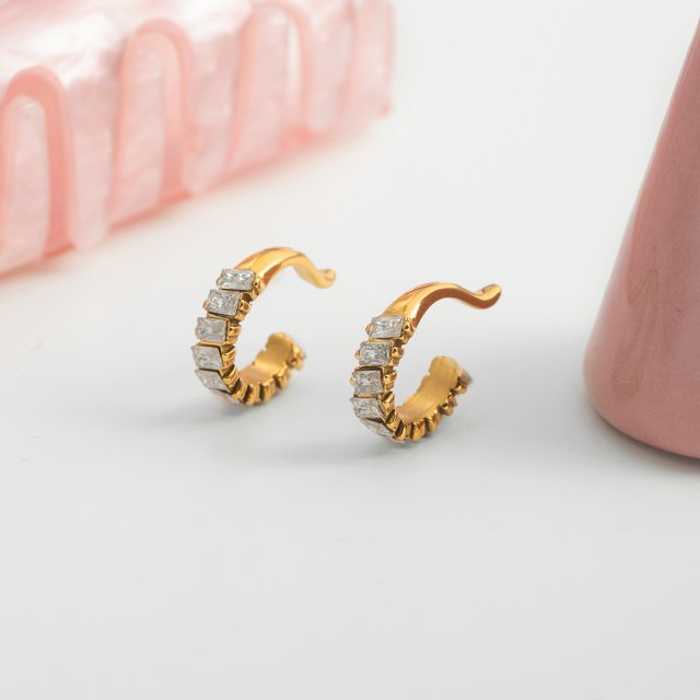 These elegant earrings feature delicate square zircon accents set along a smooth C-shaped frame, creating the perfect balance of sparkle and sophistication. Their clip-on style makes them ideal for anyone who wants stylish earrings without the need for pierced ears. Lightweight and hypoallergenic, they’re gentle on the skin and comfortable enough to wear from day to night.