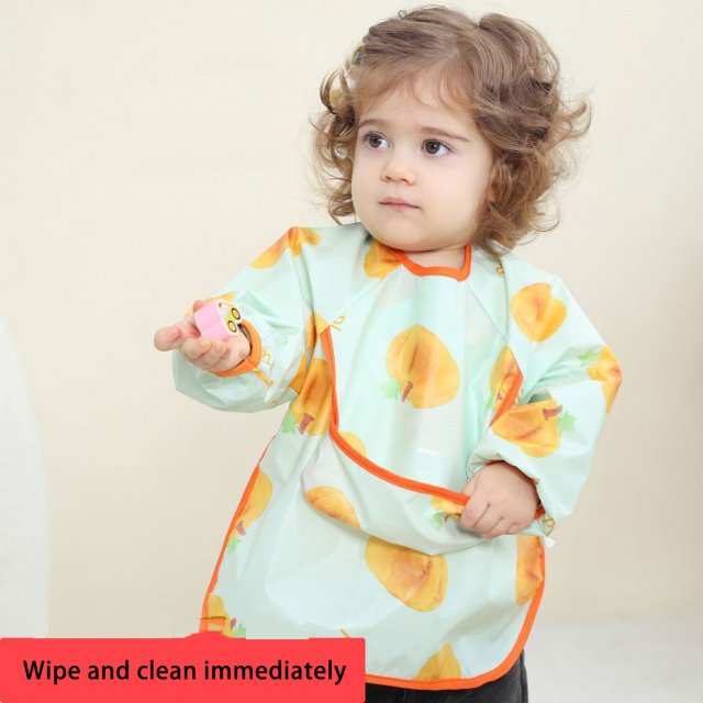 This bib combines a smooth polyester exterior with a gentle PU layer, making it completely waterproof and easy to wipe clean. Long sleeves provide extra coverage, while the soft elastic cuffs ensure a snug yet comfortable fit. Its playful cartoon prints add charm, making mealtime more enjoyable for both boys and girls.